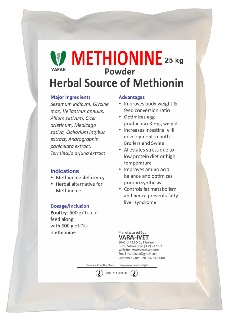 Boost your livestock’s performance naturally with VARAH Methionine Powder. This herbal alternative is designed to optimize protein synthesis, improve feed conversion, and support overall bird and swine health. It is an ideal solution for balancing amino acids and managing metabolic health in challenging environments.