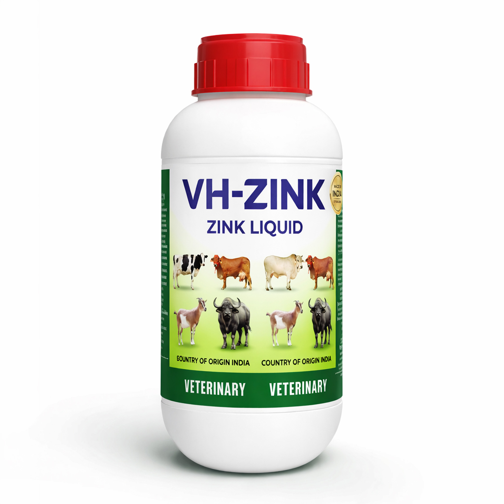 VH-ZINK Liquid is a specialized veterinary feed supplement formulated to provide essential elemental Zinc in a highly absorbable liquid form. Zinc is a critical micro-mineral for livestock, acting as a catalyst for numerous enzymatic reactions. This supplement is designed to support rapid growth, enhance reproductive fertility, and strengthen the immune system, ensuring the overall health and productivity of cattle, buffaloes, and other livestock animals.